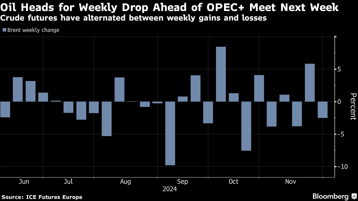 Brent crude traded near $73 a barrel after a modest gain on Thursday, with West Texas Intermediate close to $69. The producer group is now set to discuss whether to start reviving supplies, which could tip the market into a glut, at an online gathering on Dec. 5. Delegates said earlier this week that talks have begun on delaying the move.