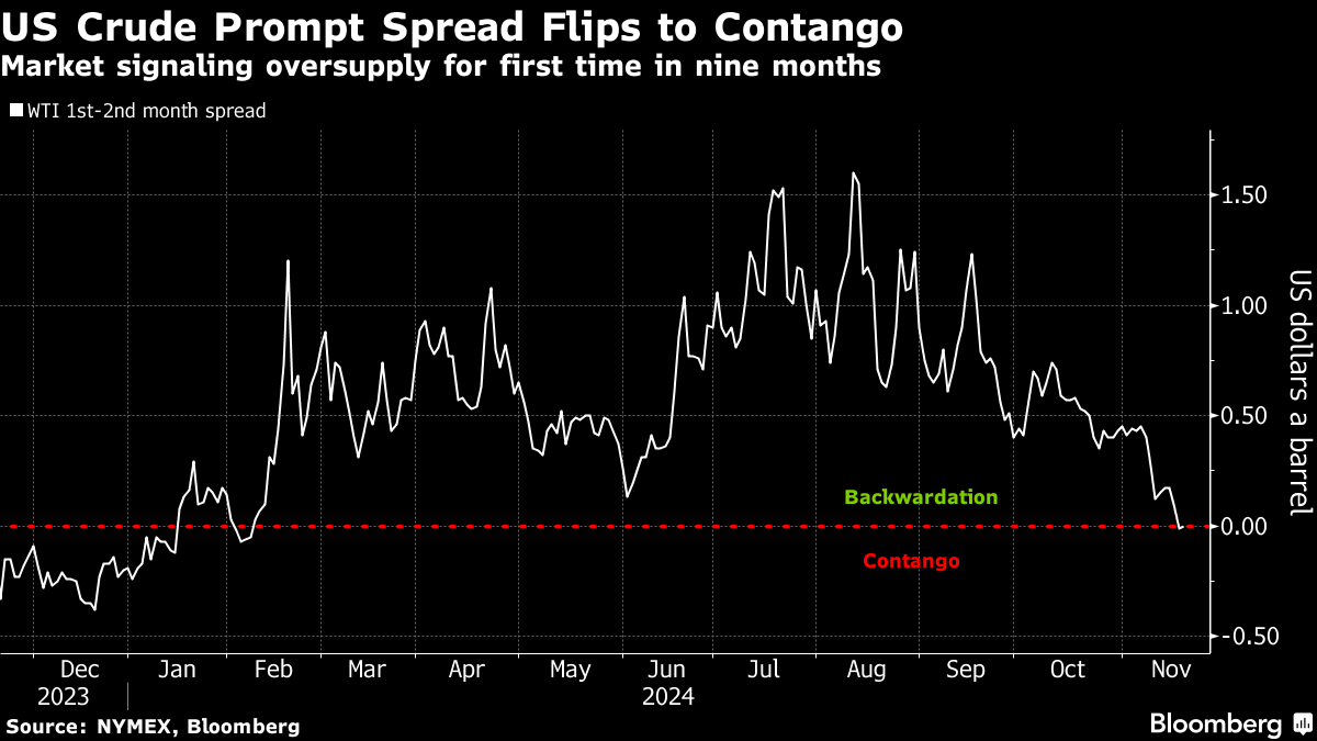 Oil is still lower for the year as concerns around Chinese demand and plentiful global supply weigh on the outlook. The prompt spread for WTI — the difference between the two nearest futures contracts — traded in a bearish contango structure on Monday for the first time since February.