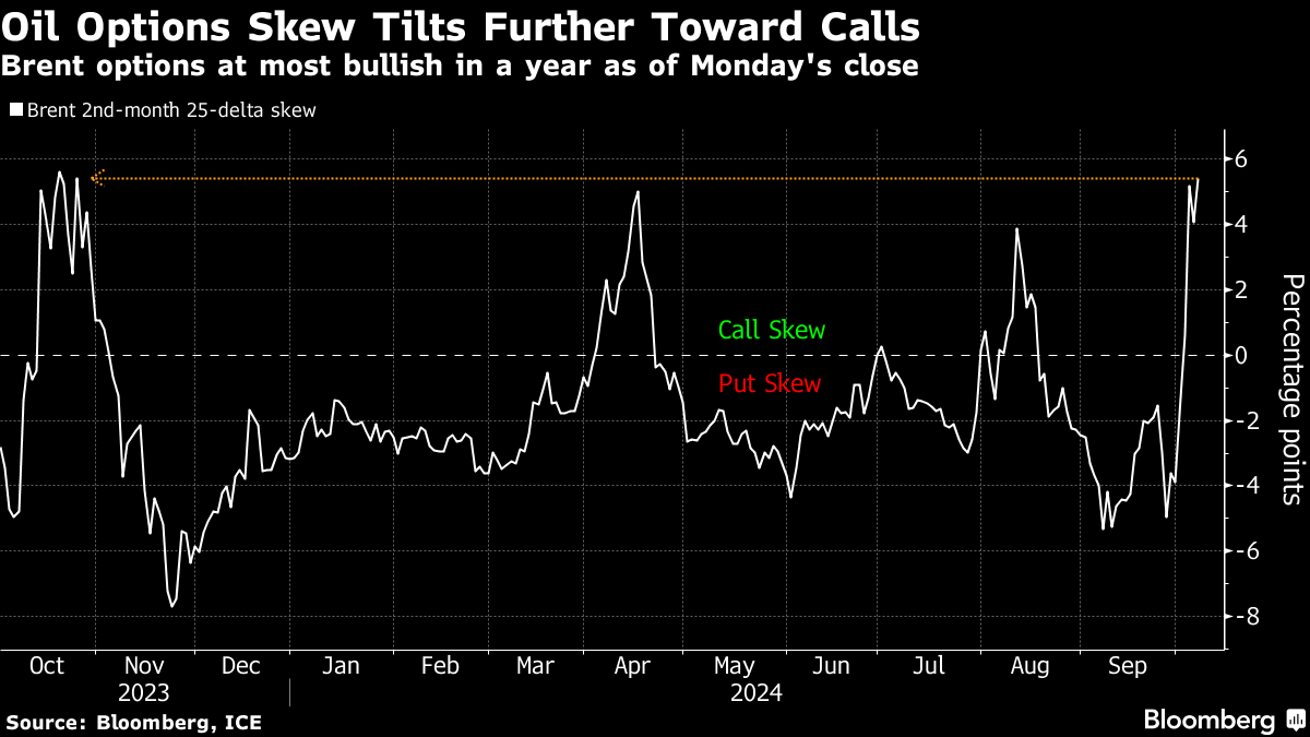 Other markets have been jolted by the hostilities, with a gauge of implied volatility for Brent near the highest in a year. There’s been a deluge of call options — which profits buyers when futures gain — and the premium of Brent calls over puts swelled to the widest in a year as of Monday’s close.