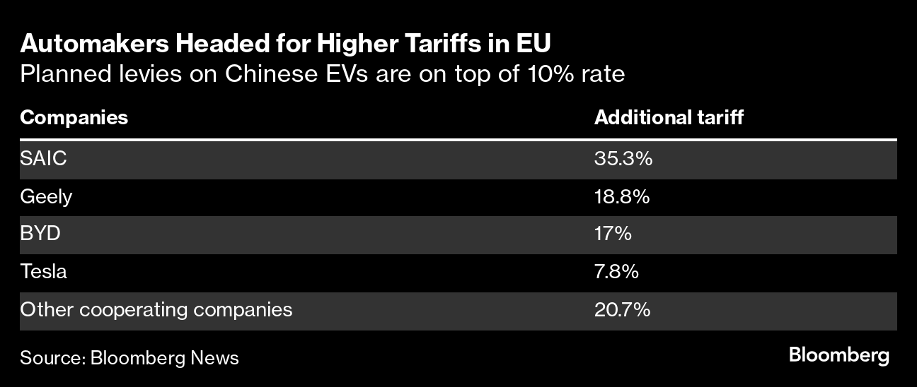 (Bloomberg) -- The European Union unleashed one of its most powerful economic tools on China, imposing tariffs on electric vehicles in a move that increases the risk of retaliatory measures and backfiring on domestic consumers and companies.