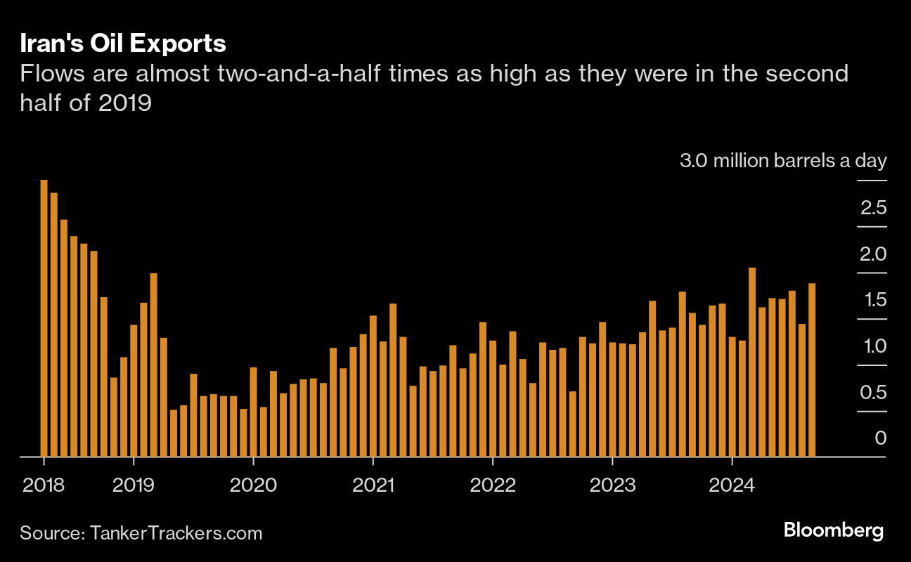 Iran’s oil exports averaged 1.7 million barrels a day in the third quarter of this year, almost two-and-a-half times as high as they were in second half of 2019, according to data from TankerTrackers.com Inc., which has been monitoring the nation’s shipments using satellite data for years. Nor were they obviously impeded even when there was concern that Israel might strike at the Islamic Republic’s oil installations.