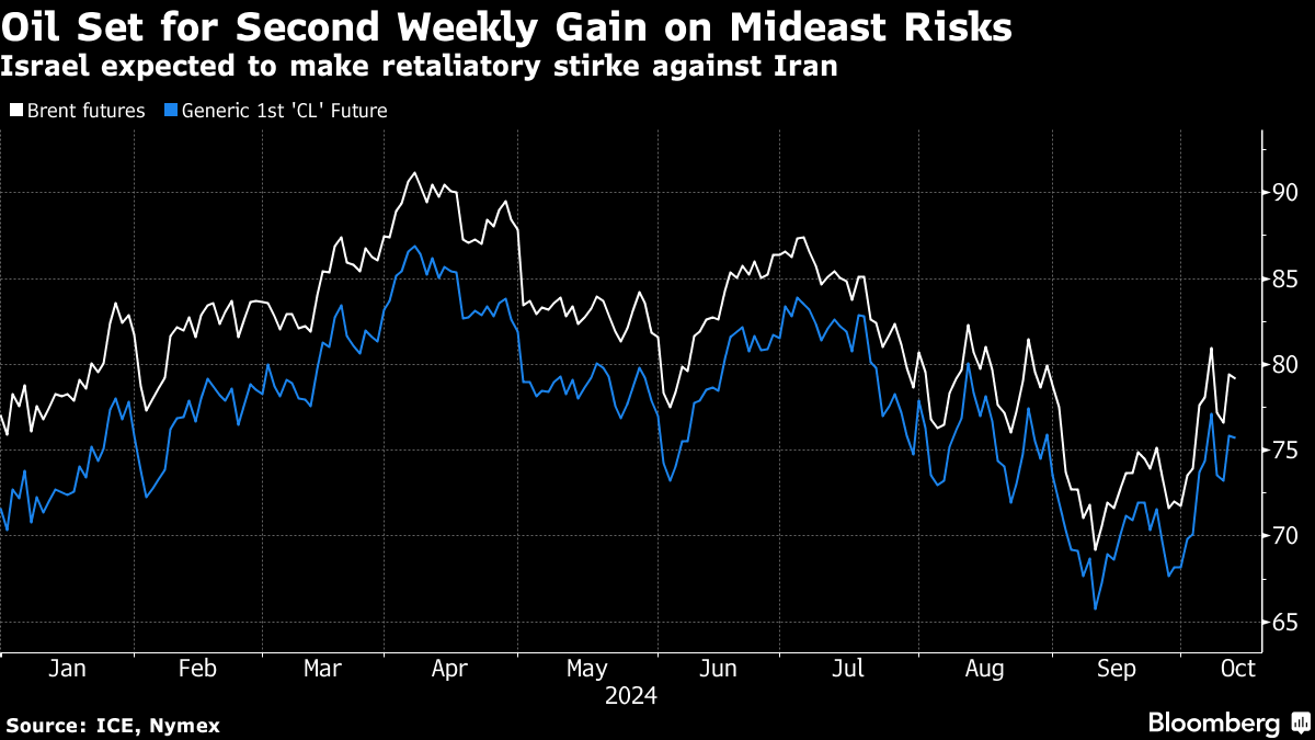 (Bloomberg) -- Oil edged lower — while remaining on course for a second weekly gain — as Israel readied plans to retaliate against Iran, raising the specter of disruptions to crude supplies from the Middle East.