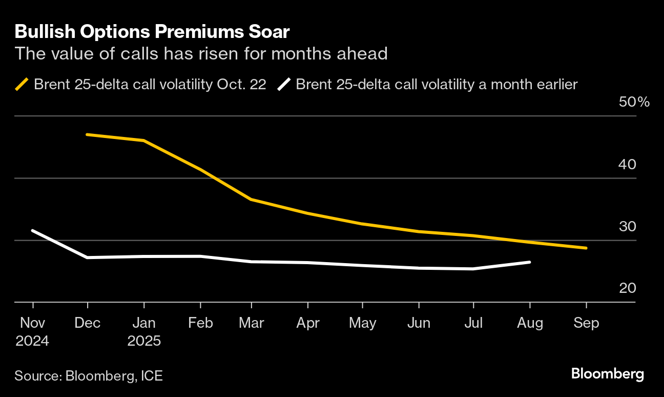 The protection against a spike also shows up in the way the oil market is pricing options contracts. Nearby Brent call options are fetching the biggest premium to bearish puts since March 2022, shortly after Russia invaded Ukraine.