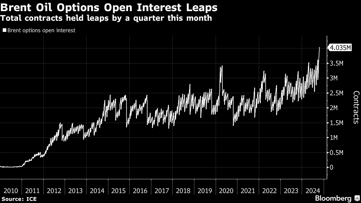 Brent options open interest this week topped 4 million contracts for the first time — the equivalent of four billion barrels. The total number of positions held by traders has jumped by more than 25% so far this month.