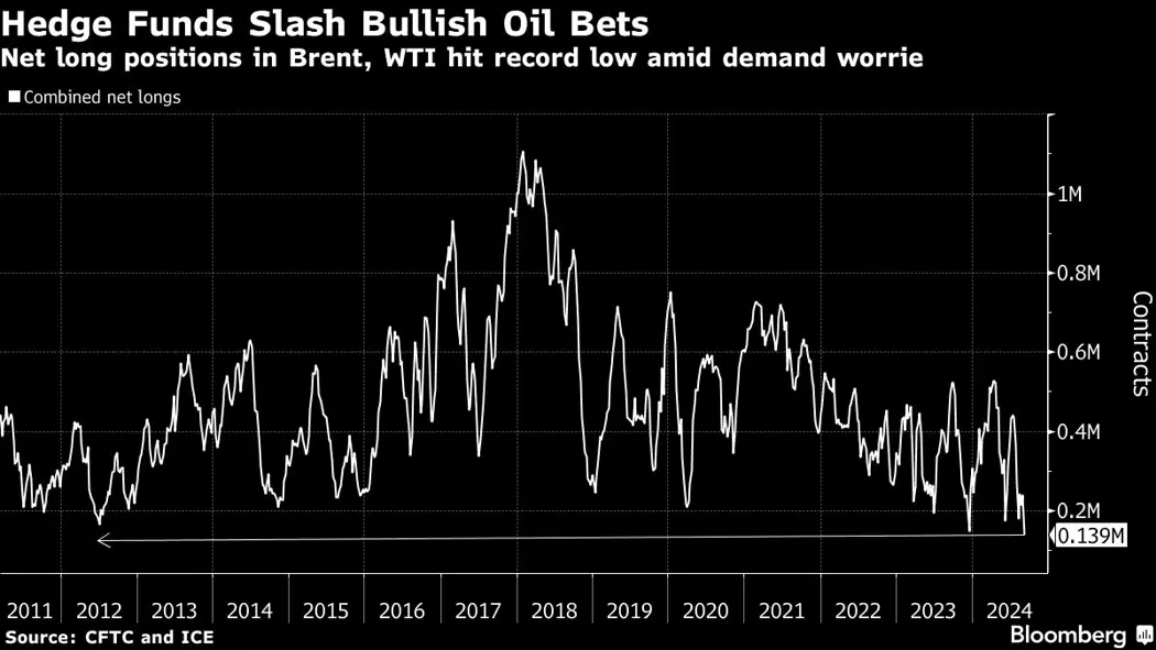 (Bloomberg) -- Hedge funds turned the least bullish on crude in records going back more than 13 years on the prospect of swelling supplies and waning demand.