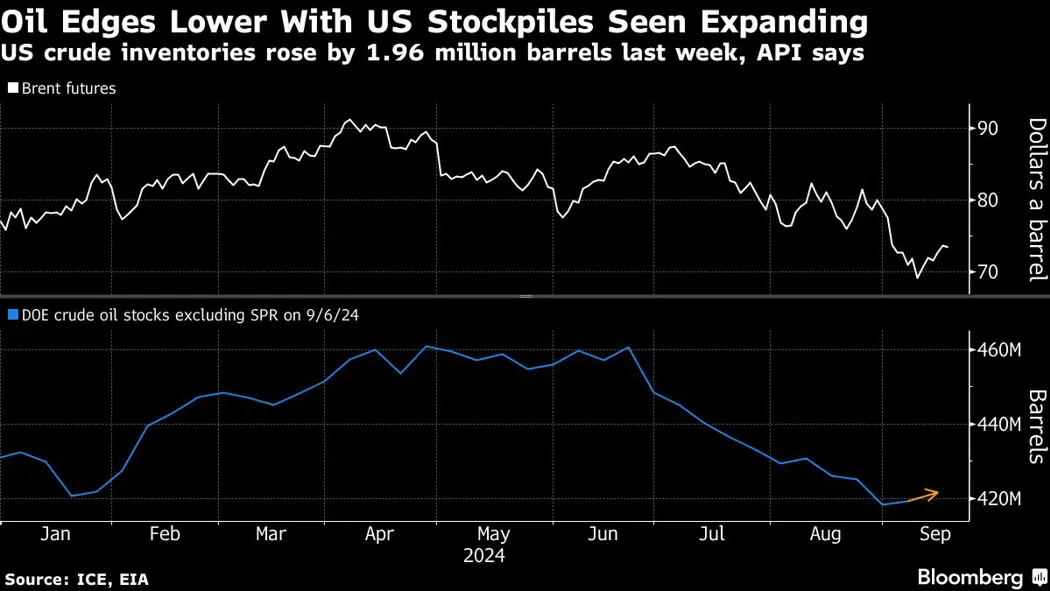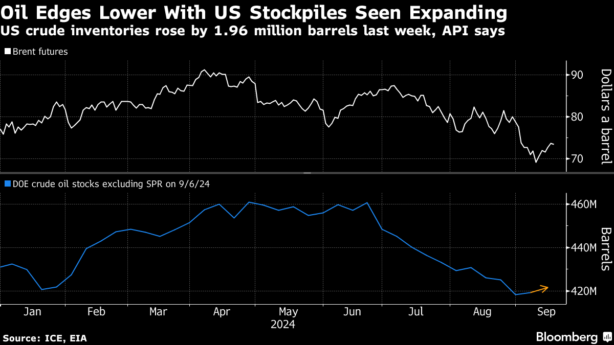 Global benchmark Brent fell toward $73 a barrel, while West Texas Intermediate traded near $71. An American Petroleum Institute report showed crude inventories rose by almost 2 million barrels last week, with gasoline and distillates holdings also expanding, according to people familiar with the data.