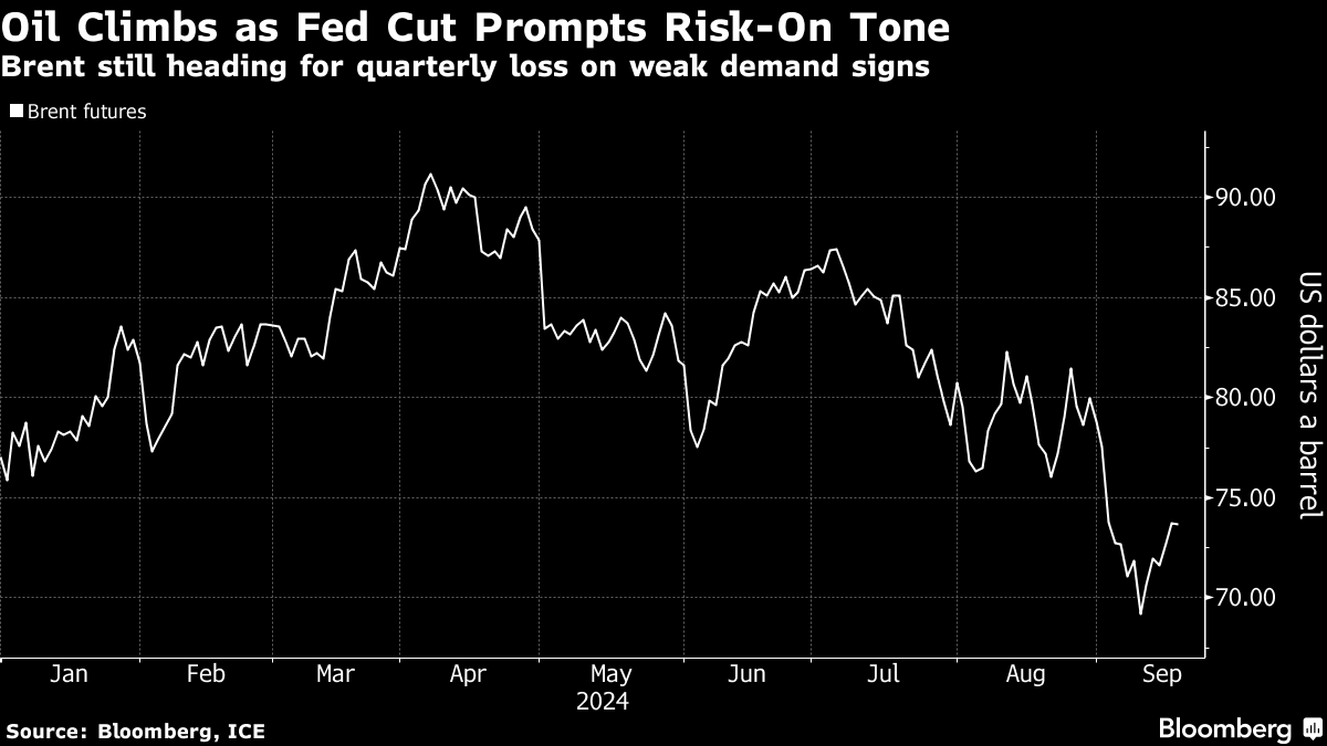 Brent futures climbed to near $74 a barrel after closing little changed on Wednesday, while West Texas Intermediate was above $71. European stock futures gained alongside Asian equities as the Fed’s move reinforced expectations that the US economy will avoid a downturn.