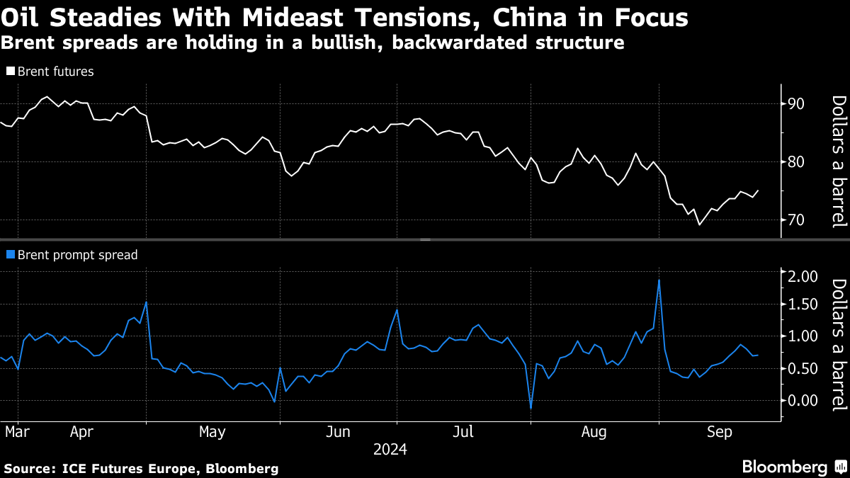Brent crude traded near $75 a barrel after rising 1.7% on Tuesday, with West Texas Intermediate above $71. Iran’s President Masoud Pezeshkian said that Israeli attacks in Lebanon “cannot go unanswered,” while also urging Western nations to come back to a nuclear accord and lift sanctions on his country.