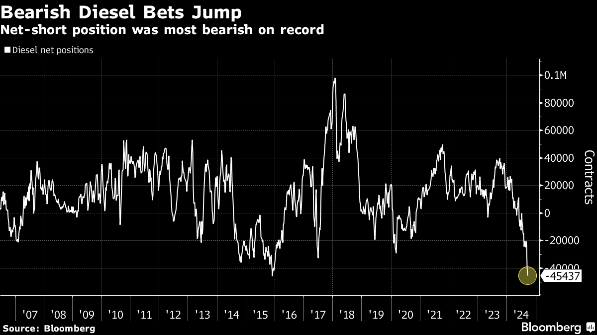 Optimism around US rate cuts has driven a 9% rally in Brent since it sank earlier this month. However, concerns of a worsening fuel demand outlook, which made hedge funds the most bearish on diesel on record, have kept gains in check.