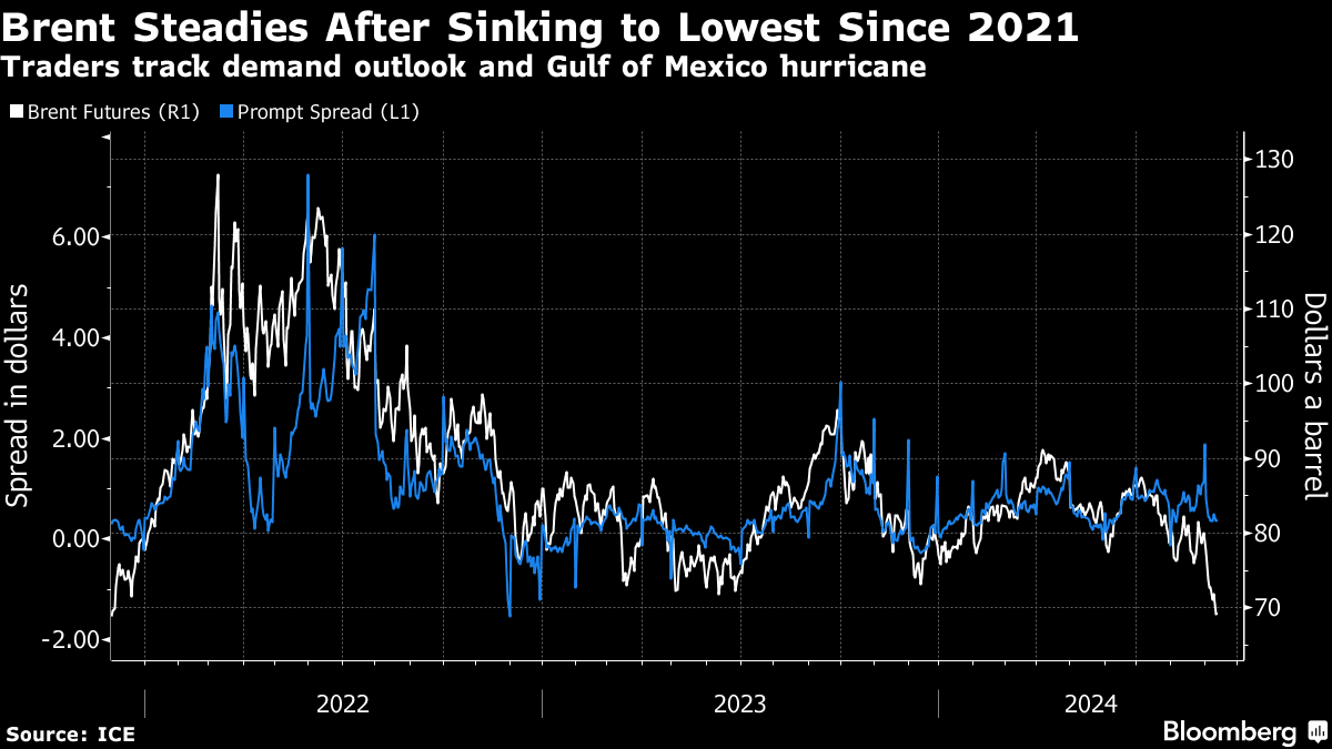 (Bloomberg) -- Oil steadied after fast-escalating concerns about global demand ignited a swift and powerful selloff that drove Brent crude below $70 a barrel for the first time in more than two years.