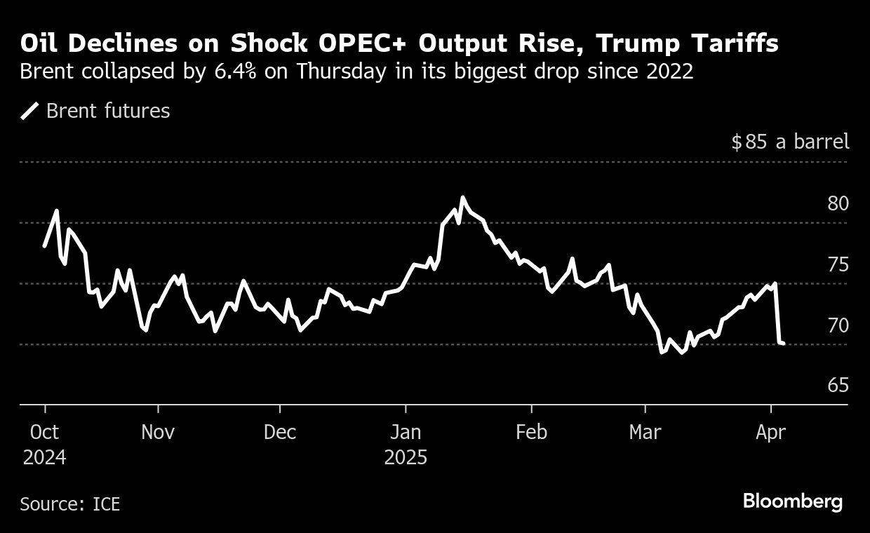 Brent crude fell below $70 a barrel after plunging 6.4% on Thursday, while West Texas Intermediate was near $66. Hours after Trump’s deluge of tariffs created fresh doubts about the outlook for the global economy, OPEC and its allies tripled a planned output hike for May in what delegates described as a deliberate effort to drive down prices to punish members that were producing more than their quota.