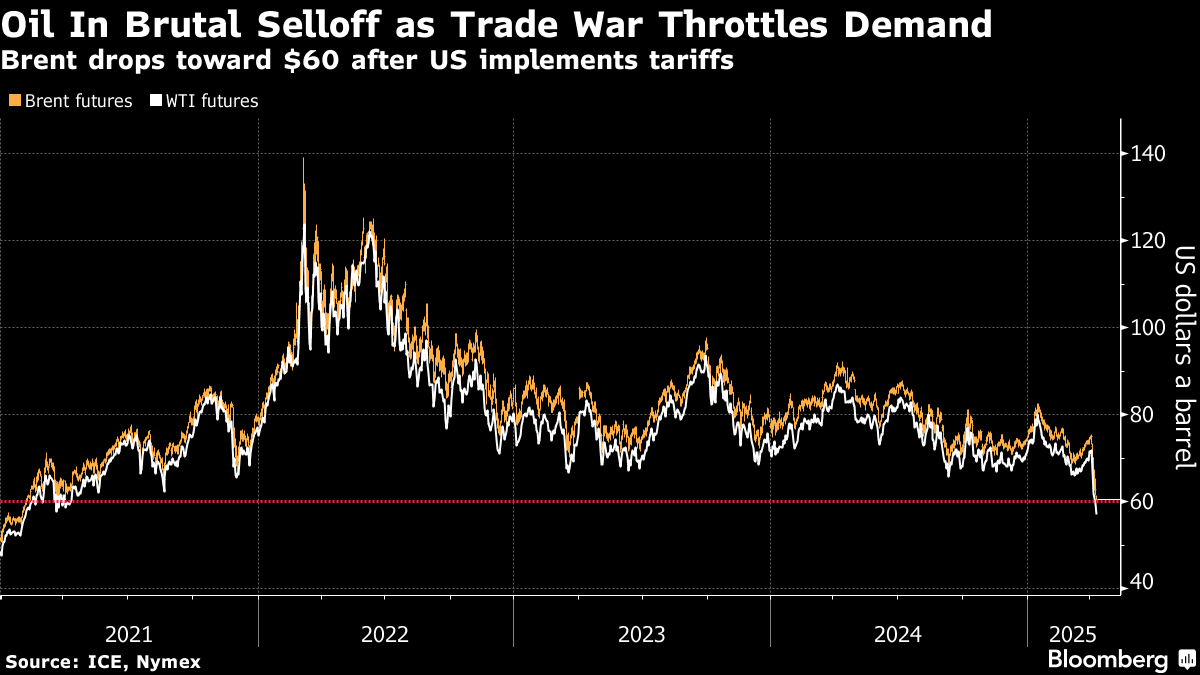 Brent sank as much as 4.2% to drop toward $60 a barrel, as West Texas Intermediate fell for a fifth day. US President Donald Trump’s so-called reciprocal tariffs are now in place, dealing a heavy blow to the world economy, raising the risk of further retaliation and stoking fears of a recession.