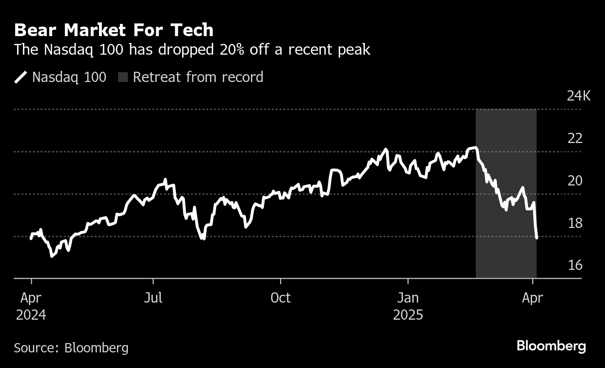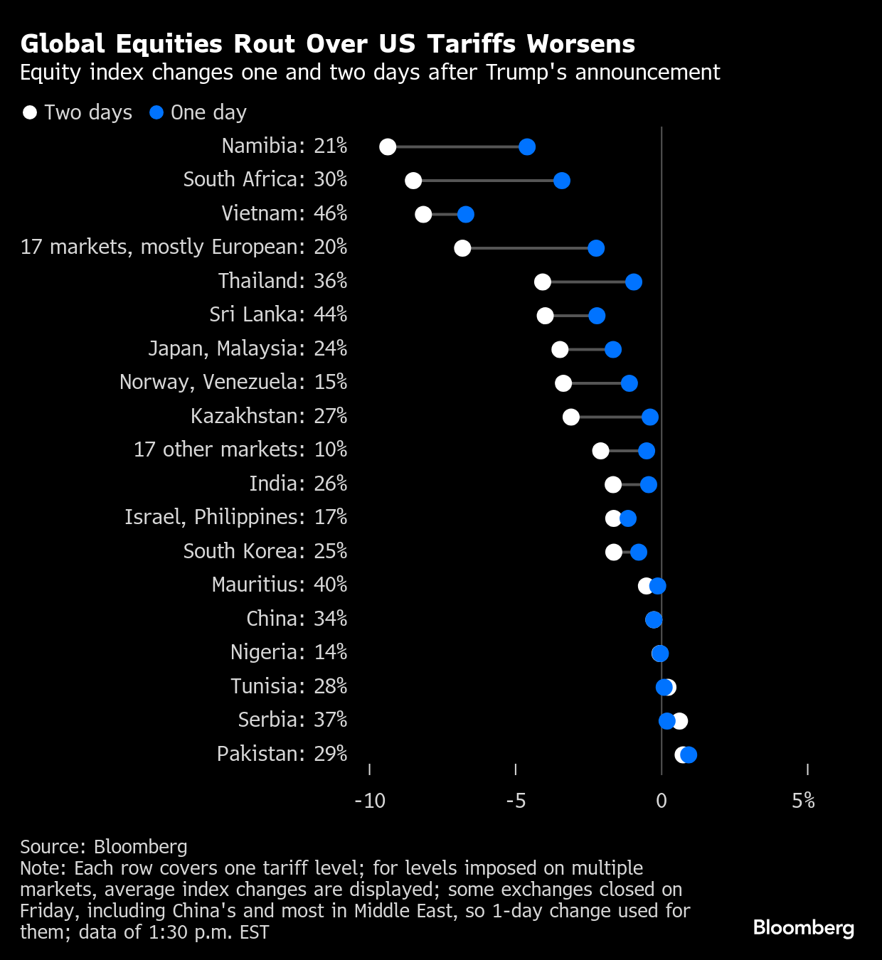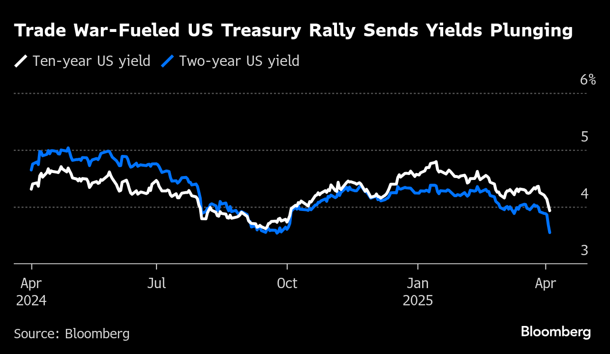 Despite the economic risks from President Donald Trump’s trade war that just included China’s retaliation, Powell reiterated a wait-and-see approach on rates. The S&P 500 was on pace for its worst two-day plunge since March 2020 in a rout that has shed about $5 trillion in value, with the gauge down almost 6% on Friday. The Nasdaq 100 was set for a bear market. Treasury 10-year yields slid six basis points to 3.98%. Money markets fully priced in four Fed reductions this year and the chance of a fifth. The dollar rose 1%.