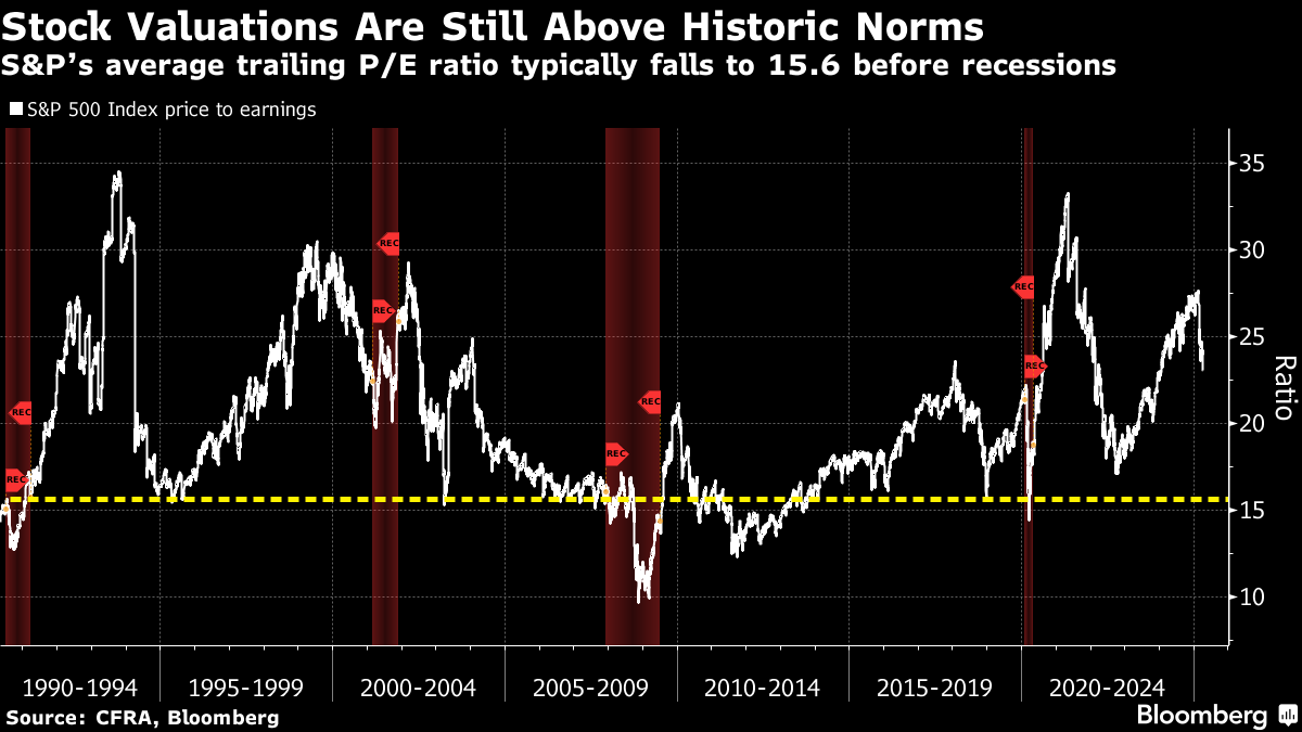 The fastest US stock market selloff since the depths of the Covid pandemic has left valuations looking cheap. But if a recession is inevitable due to the global trade war, the definition of inexpensive becomes relative.