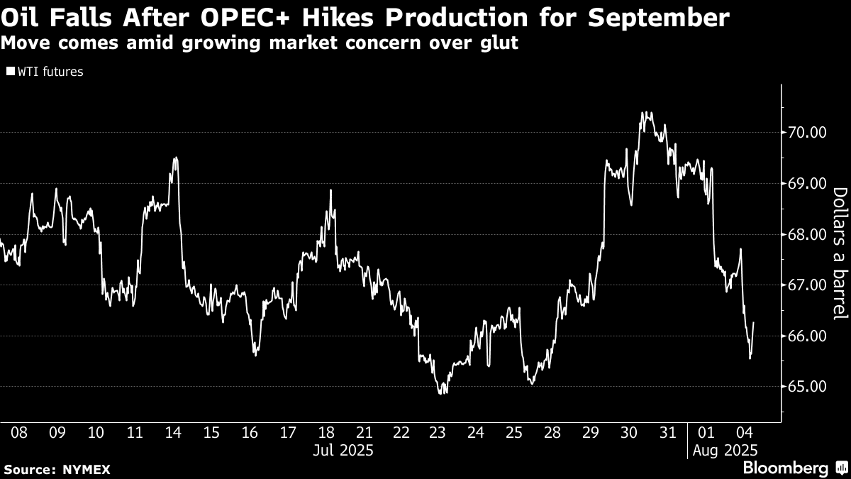 (Bloomberg) -- Oil prices fell in choppy trading as traders took stock of OPEC+’s latest bumper supply increase while US President Donald Trump vowed to penalize India for buying Russian crude, mitigating some fears about a glut.