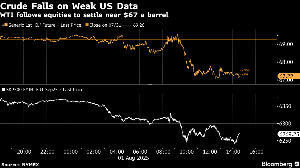 (Bloomberg) -- Oil sank as the outlook for the world’s largest economy darkened after a barrage of poor US data and tariff announcements, weighing on the prospects for energy demand growth.