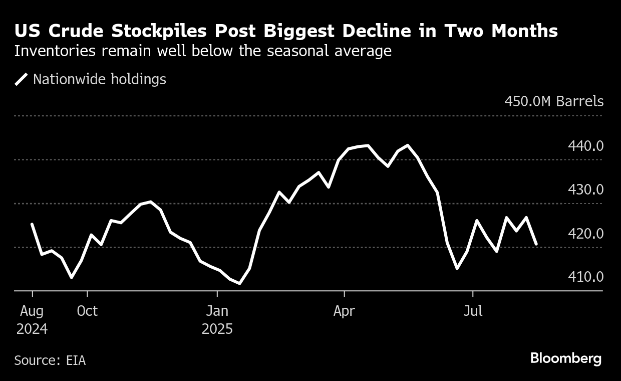 (Bloomberg) -- Oil held a gain after US crude stockpiles shrunk the most since mid-June, keeping inventories well below the seasonal average.