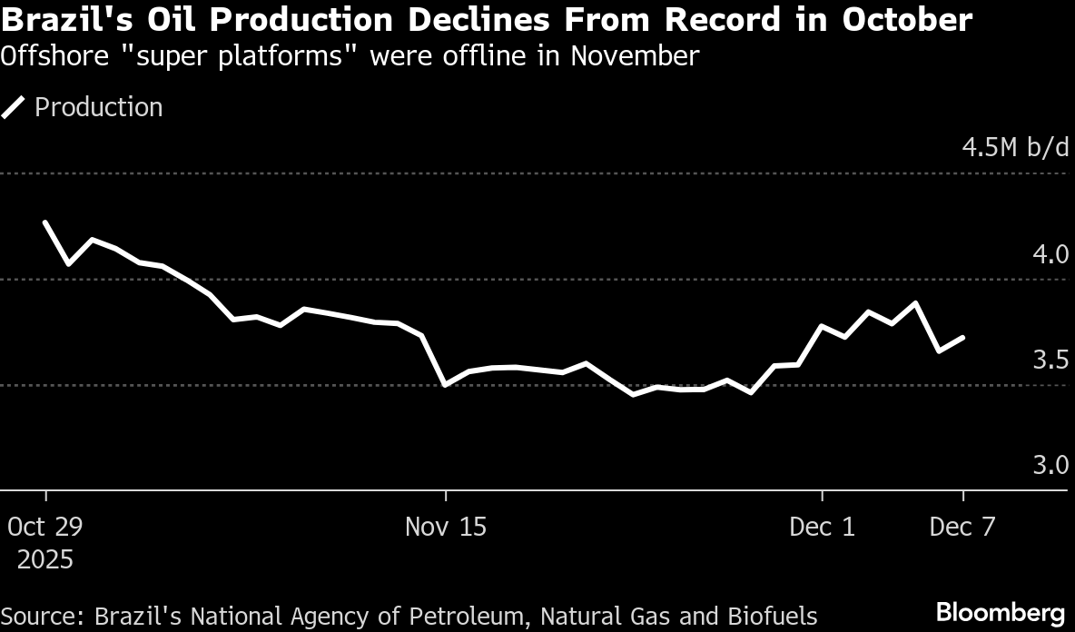 Brazil’s daily oil production slid roughly 8% to an average of 3.696 million barrels in November, according to Bloomberg calculations based on preliminary figures from oil regulator ANP. The drop from an all-time high the previous month stemmed from platform outages at offshore fields such as the mammoth Buzios.