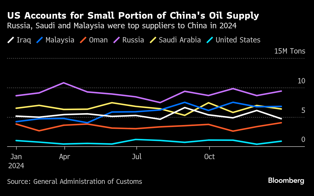 The world’s top oil importer has been seeking to diversify its raw material supplies, and crude imports from the US have dwindled from their peak in 2020. The nation received an average of six million barrels a month last year, accounting for about 2% of its overall imports in 2024, according to customs data.