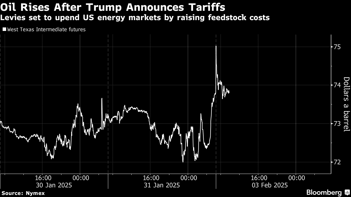US marker West Texas Intermediate jumped as much as 3.7% before paring about half of those gains to trade near $74 a barrel. Global benchmark Brent was above $76. Trump followed through on his threats to impose levies of 25% on Canadian and Mexican imports and 10% on Chinese goods starting on Tuesday, spurring pledges of retaliation and leaving only a narrow window for last-minute negotiations.