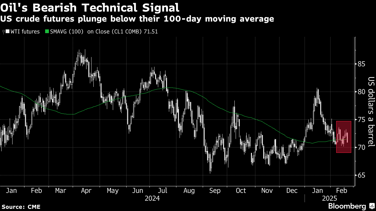West Texas Intermediate slid more than 2% to trade below $71 a barrel, with the drop deepening after prices dipped below their 100-day moving average of about $71.51. The decline puts oil at risk of its fifth straight weekly loss, which would be the longest streak in more than a year.