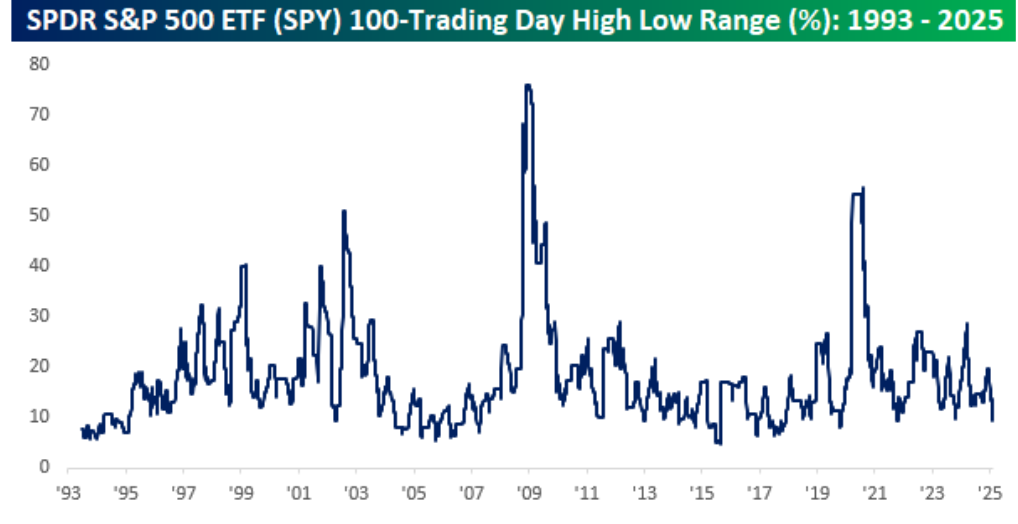 Over the last 100 trading days, the $630 billion exchange-traded fund tracking the S&P 500 (SPY) has traded in a relatively narrow range of less than 10%, according to Bespoke. While that may sound like a wide range, it ranks in just the 13th percentile of all comparable periods dating back to SPY’s inception in 1993. Back in Covid, this reading spiked above 50% and during the Financial Crisis, it widened even more, peaking above 75%.