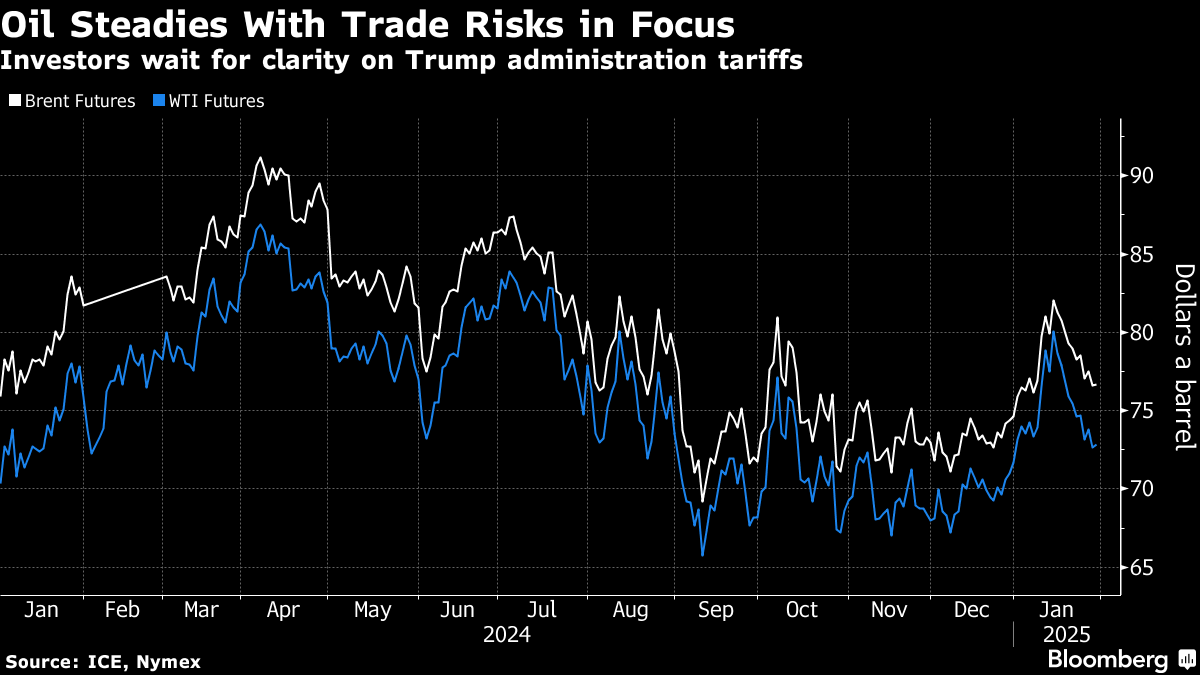 (Bloomberg) -- Oil steadied as investors waited for clarity on the US administration’s plans for trade policy, with Donald Trump’s pick for commerce secretary saying Canada and Mexico may be able to avoid levies.