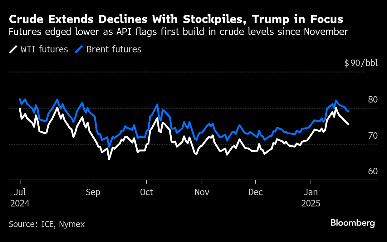 Brent dropped below $79 a barrel, extending a run of losses that started last Thursday, while West Texas Intermediate was near $75. Inventories rose by 1 million barrels last week and fuel stockpiles surged, the American Petroleum Institute reported, according to a document seen by Bloomberg.