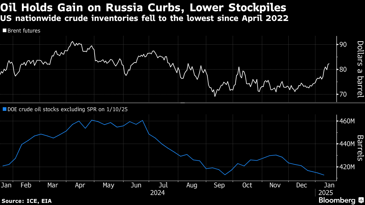 Brent crude has rallied 10% since the start of the year, helped by a cold weather fanning demand, the fall in US inventories, and multiple risks to shipments. In addition to the curbs against Russia, traders are concerned the incoming Trump administration may both tighten sanctions against Iran, and impose trade levies that disrupt oil flows or risk drawing retaliatory measures.