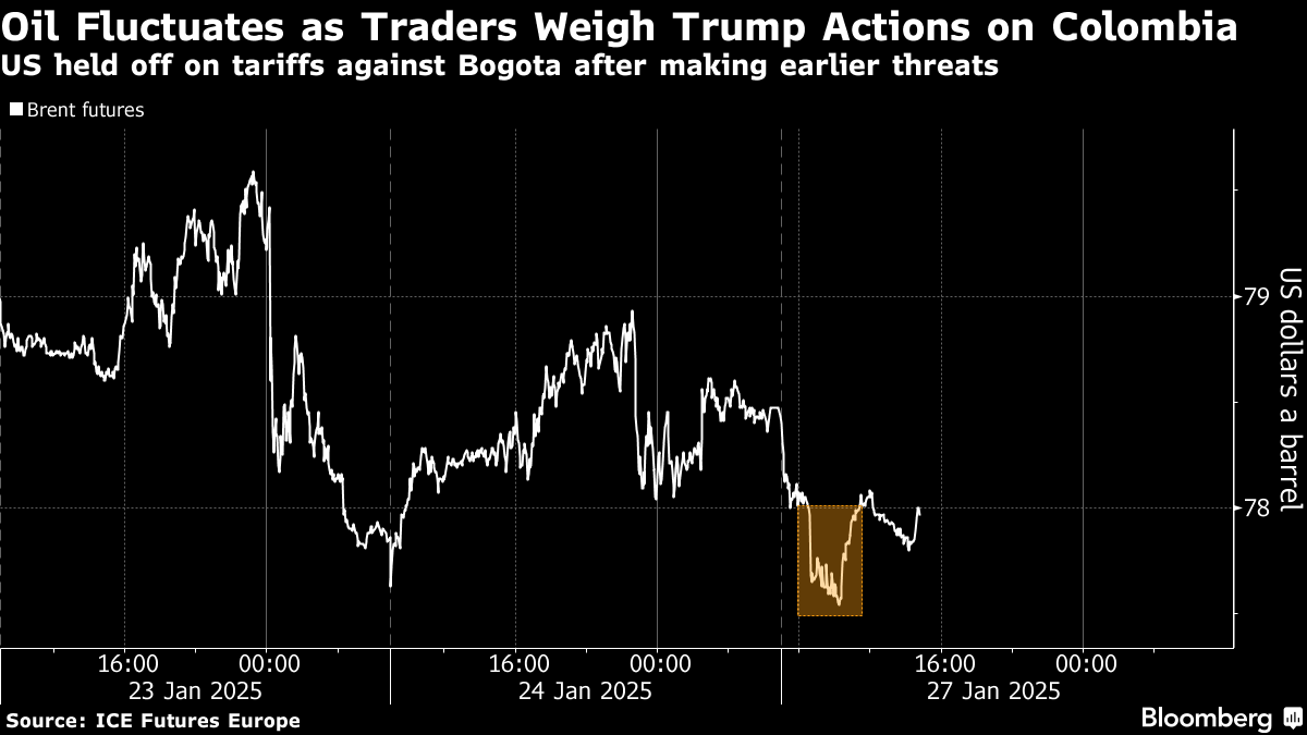 (Bloomberg) -- Oil fluctuated as investors reacted to rapid-fire moves on trade by the Trump administration, with the US threatening, and then holding off, a broad package of curbs against Colombia.