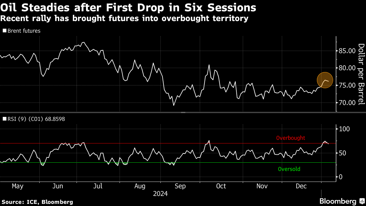 (Bloomberg) -- Oil steadied following its first decline in six sessions, as technical markers showed the recent rally may have gone too far.
