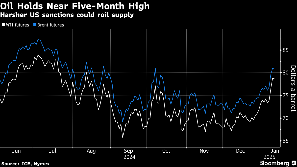(Bloomberg) -- Oil held near a five-month high on threats to global supplies posed by harsher US sanctions against Russian flows and potential trade tariffs from the incoming Trump administration.