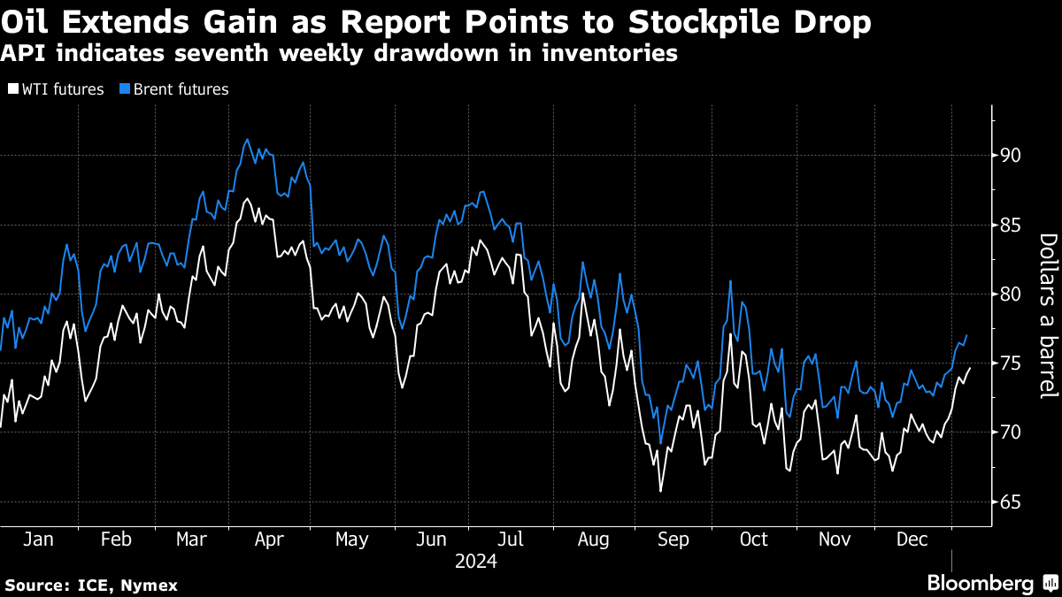 Brent traded above $77 a barrel, after gaining 1% on Tuesday, while West Texas Intermediate was near $75. US stockpiles shrunk by 4 million barrels last week, the American Petroleum Institute reported, which would be a seventh straight draw and the longest streak of declines in three years if confirmed by government data later Wednesday.
