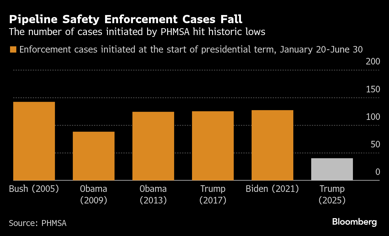 The Pipeline and Hazardous Materials Safety Administration opened 40 enforcement cases between January 20 and the end of June, according to filings from the regulator. That’s the least for the beginning of any presidential term in data going back two decades and a 68% slide compared with Trump’s first months in office eight years ago.