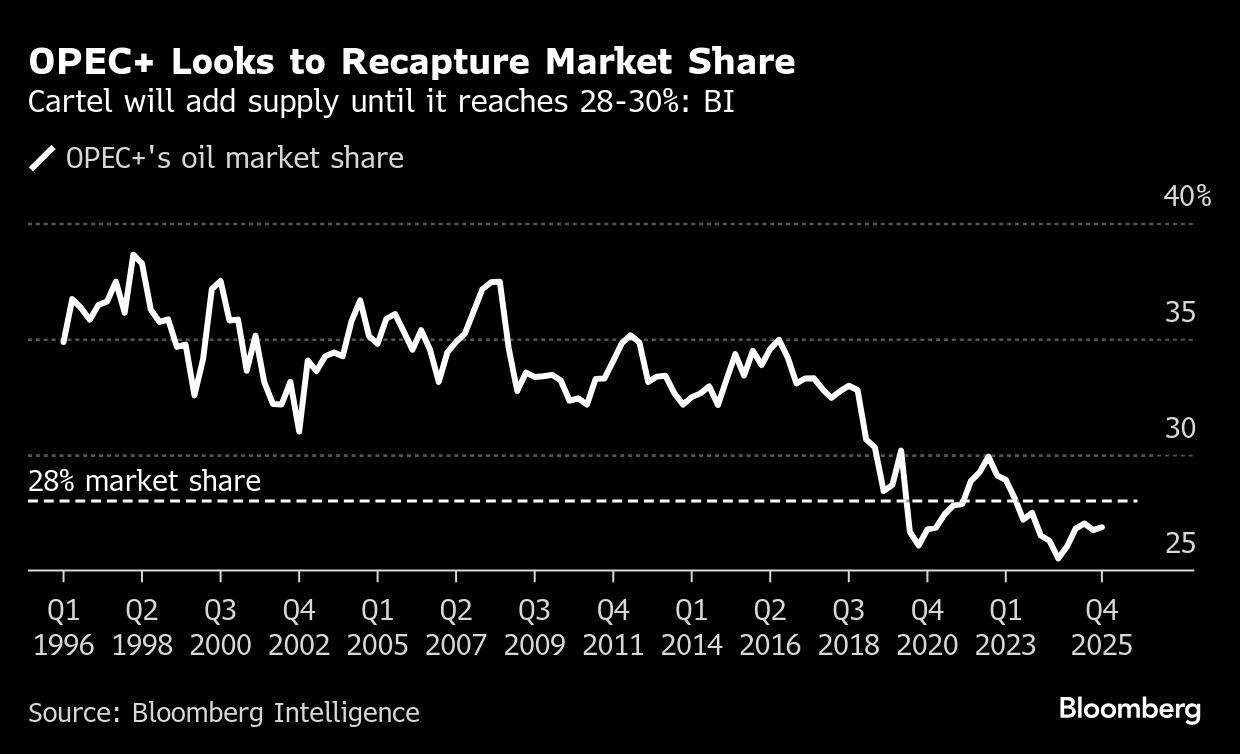 There have been talks to shift the virtual session of the Organization of the Petroleum Exporting Countries and allies to Saturday from Sunday, several delegates said. The group will add output until its market share returns to 28% to 30%, with markets facing a surplus of as much as 600,000 barrels a day this quarter, according to Bloomberg Intelligence analyst Henik Fung.