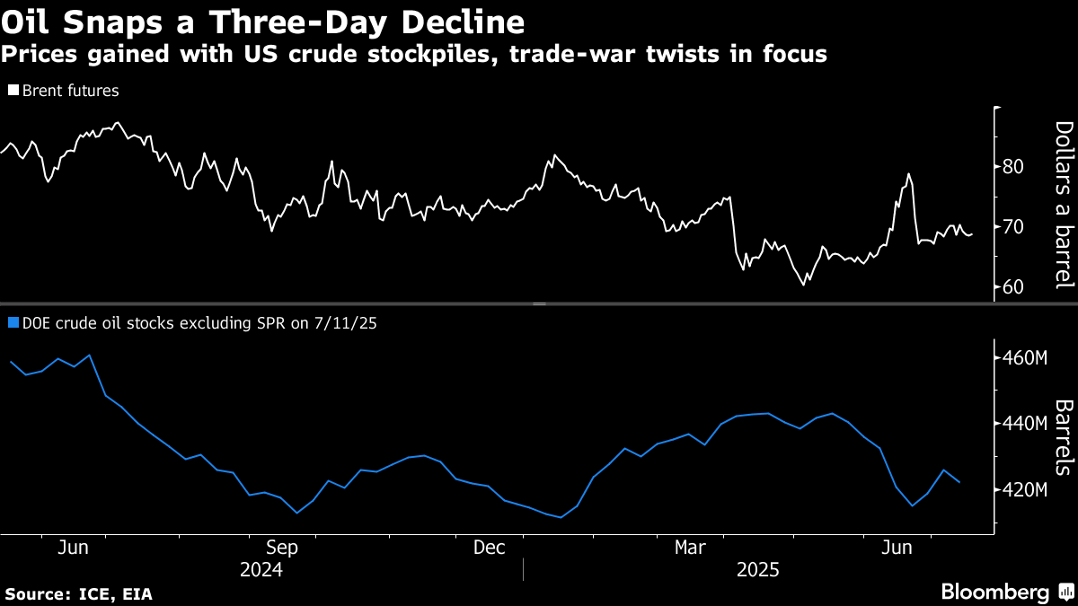 Brent rose toward $69 a barrel after shedding more than 2% over the previous three sessions, while West Texas Intermediate was near $67. US government data released on Wednesday was mixed, with an increase in distillate inventories but a decline in nationwide crude holdings.