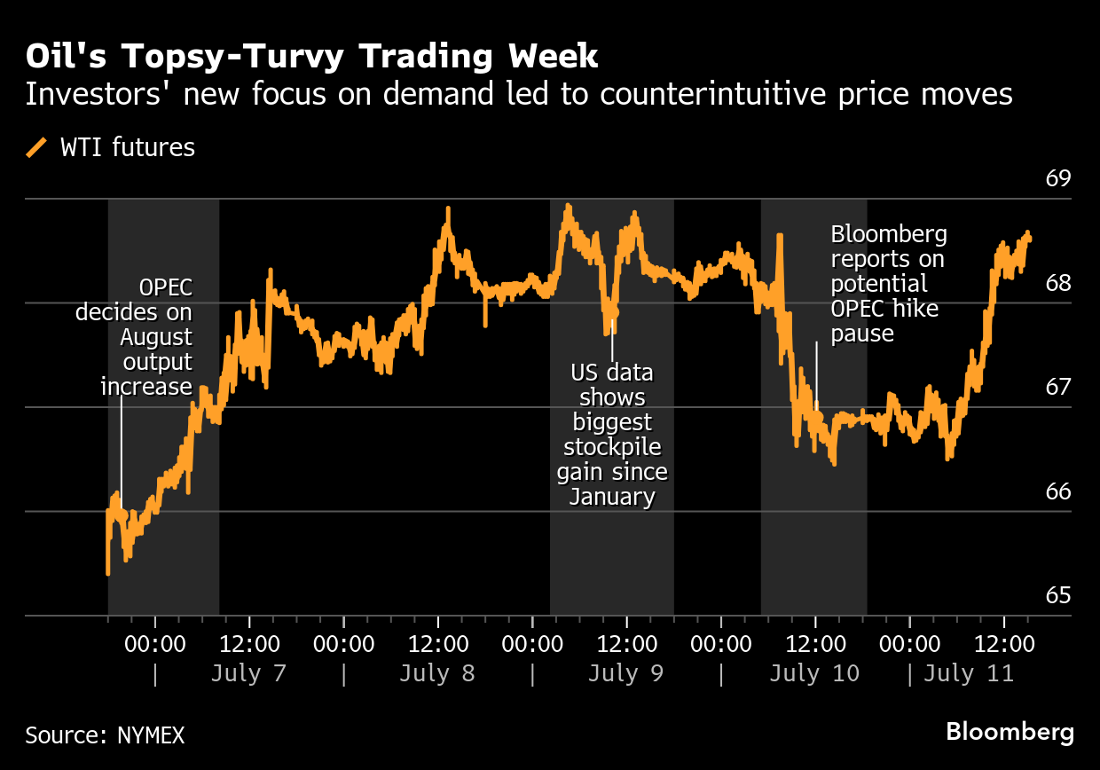 This week’s price moves also illustrate just how much demand concerns are driving the market. Oil futures shrugged off a decision by OPEC+ on Sunday to bring back more production than expected in August and instead rose after Saudi Arabia hiked prices for customers in Asia, which was viewed as a vote of confidence in demand.