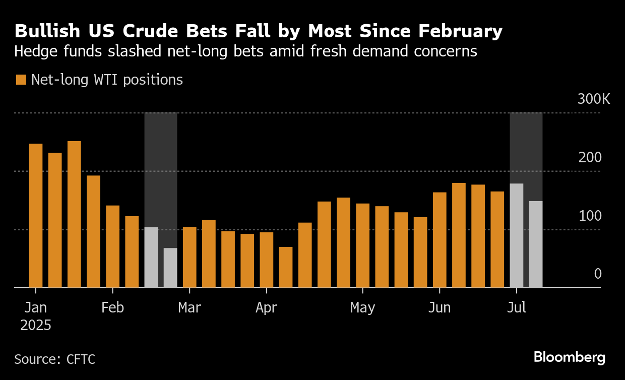 The rapidly weakening outlook triggered the sharpest drop in hedge fund sentiment on oil since February. Money managers slashed their bullish position in US crude by 29,994 lots to 148,106 lots in the week ended July 8, according to the Commodity Futures Trading Commission. Short-only bets rose to a five-week high, the figures show.