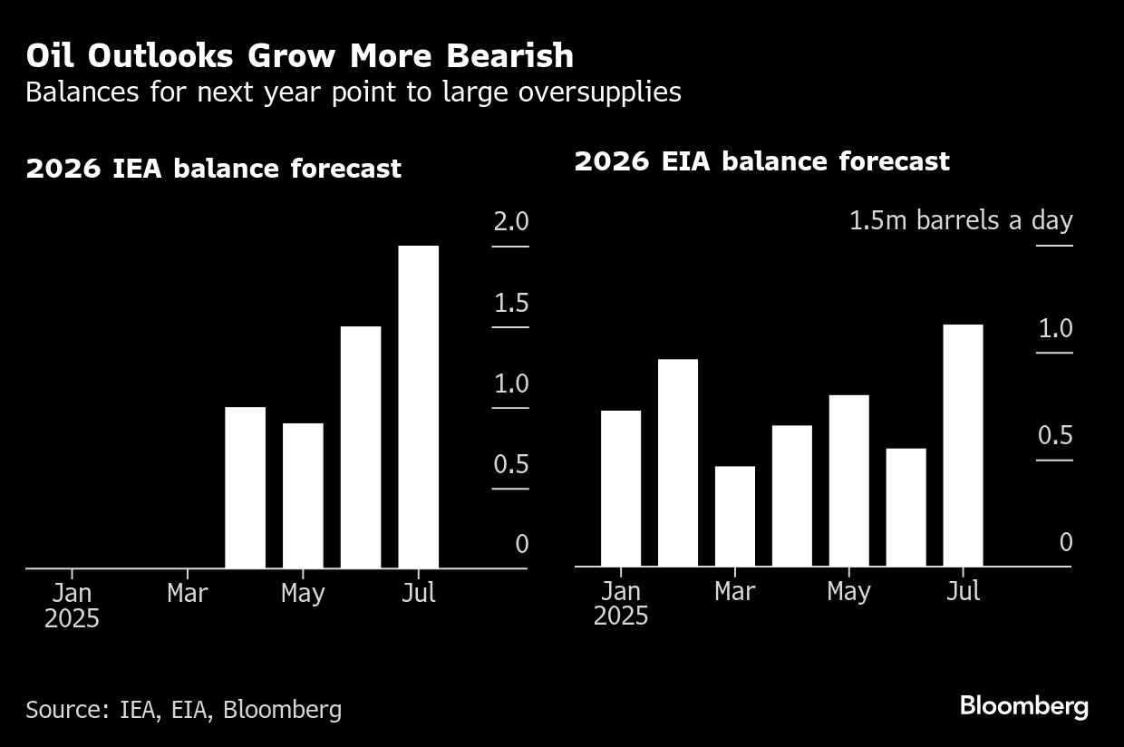 Both the International Energy Agency and the US Energy Information Administration earlier this month bolstered their estimates for the surplus they see next year. The two widely-followed forecasters expect supply to eclipse demand by the most since the pandemic, with the IEA’s projection at 2 million barrels a day.