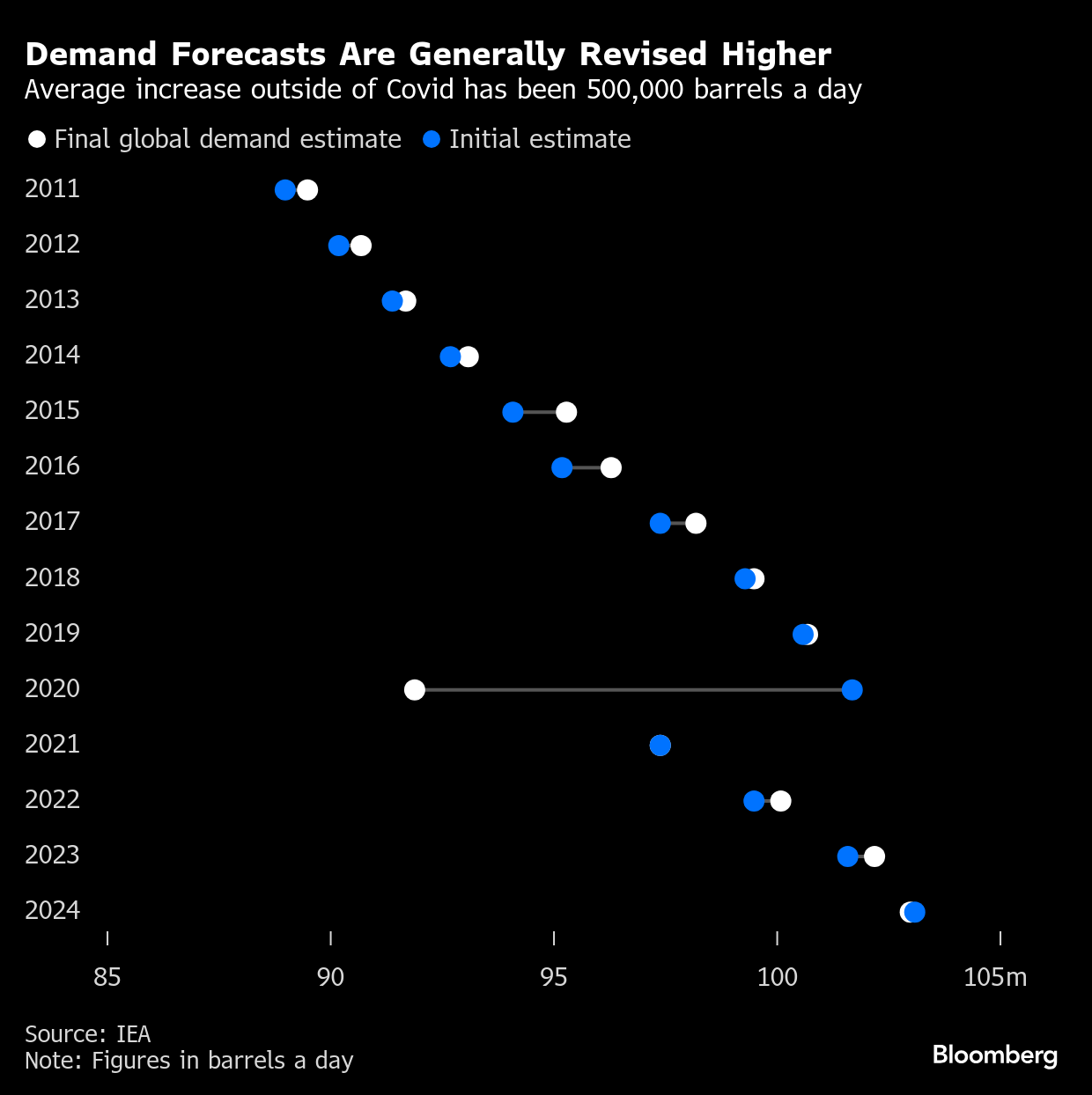 From 2012 to 2024, the IEA’s demand forecasts have ended up being on average close to 500,000 barrels a day higher than when the estimate was first issued, as more data became available. That excludes 2020, when the global pandemic transformed consumption patterns.