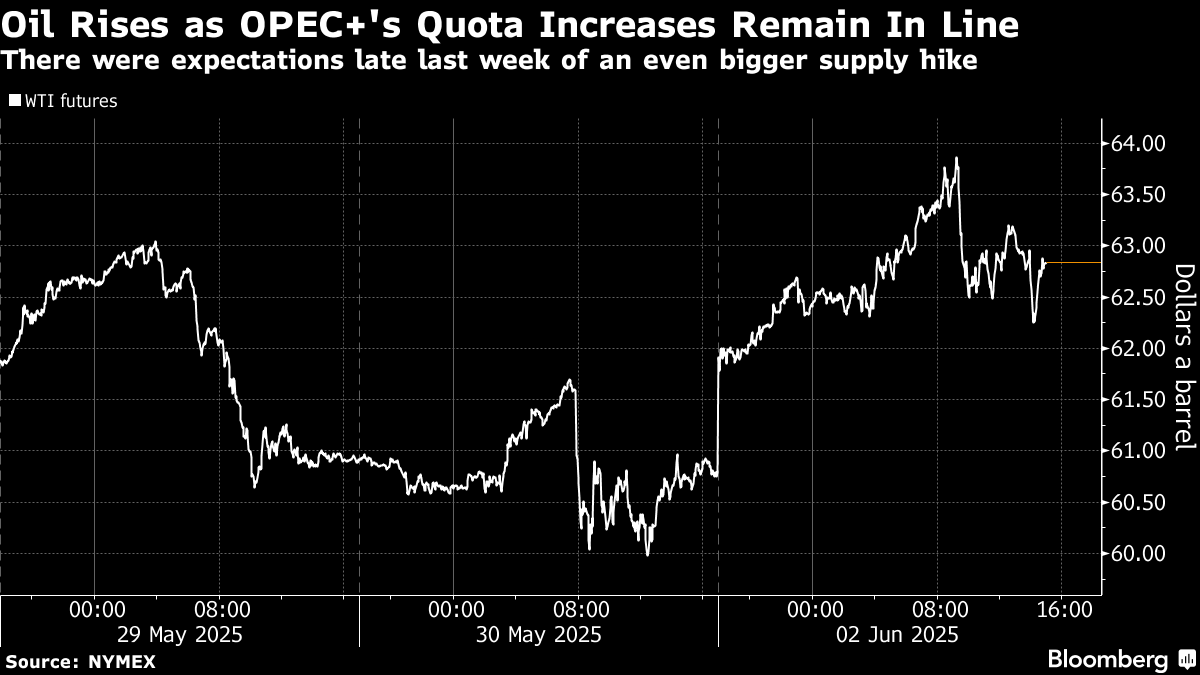 West Texas Intermediate gained 2.8% to settle near $63 a barrel after the Organization of the Petroleum Exporting Countries and its allies agreed on Saturday to add 411,000 barrels a day of supply in July though some members objected, including Russia. With a handful of countries lobbying for a pause in July, banks are now split on how many more hikes will come in subsequent months.