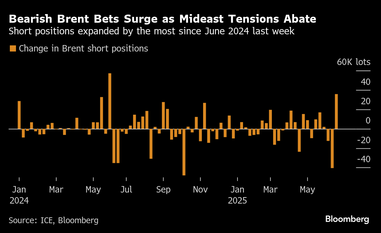 (Bloomberg) -- Oil held its biggest weekly loss in more than two years, as hedge funds piled into bearish bets after a fragile truce between Iran and Israel before a likely OPEC+ supply hike.