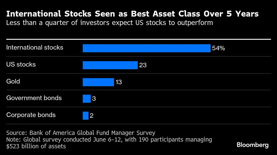 Some 54% of asset managers expect international stocks to be the top asset class, while 23% picked US equities, according to the survey. Only 13% said gold will deliver top returns, and 5% are betting on bonds. It’s the first time that Bank of America’s survey asked investors to predict which asset class will perform best over a five-year horizon.