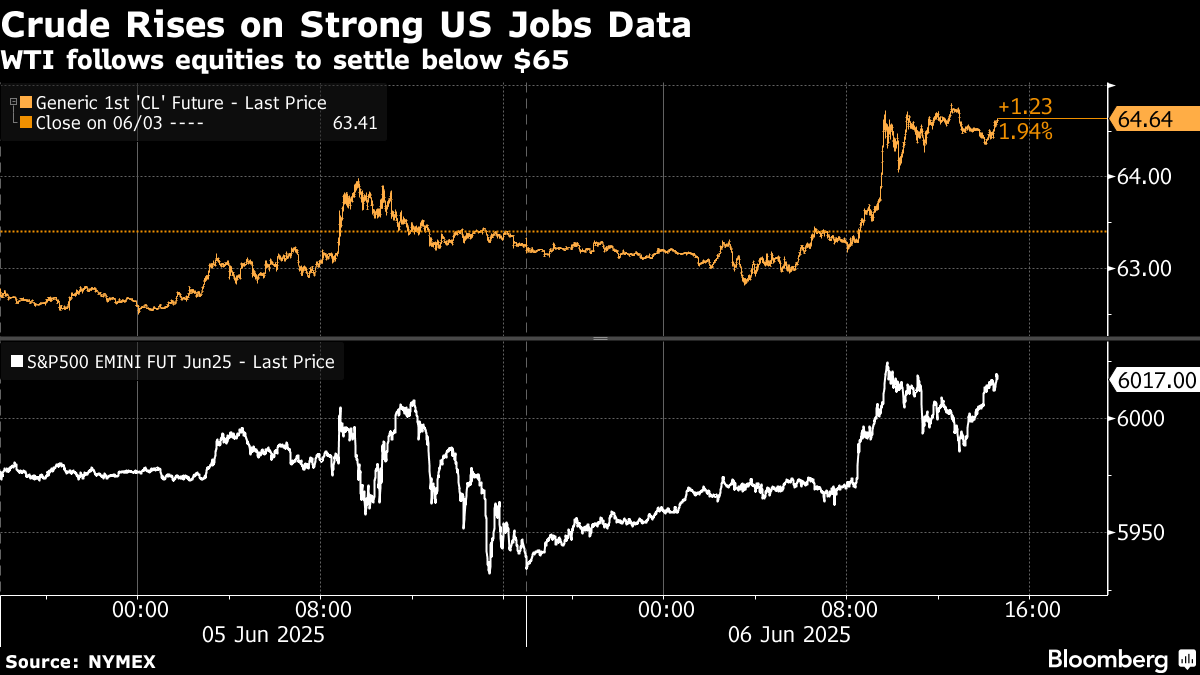 West Texas Intermediate climbed almost 2% to settle above $64 a barrel, notching the largest weekly gain since November. Crude followed equities higher after US job growth in May narrowly surpassed economist forecasts, allaying concerns of near-term demand deterioration. The figures also pushed economy-sensitive diesel futures to a two-week high.