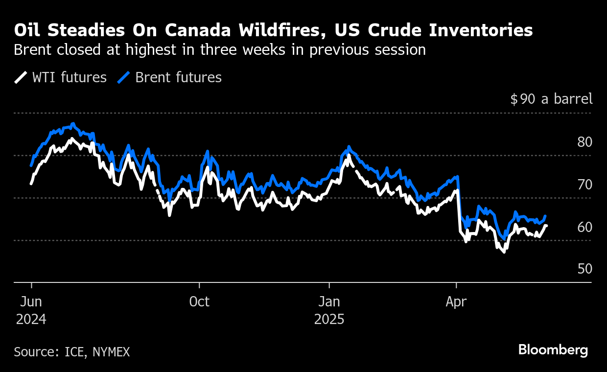 Brent traded around $65 a barrel after closing at a three-week high on Tuesday, while West Texas Intermediate was near $63. One Canadian operator restarted a site after shutting down last week, with wildfires halting about 7% of output at one stage in the world’s fourth-largest producer.
