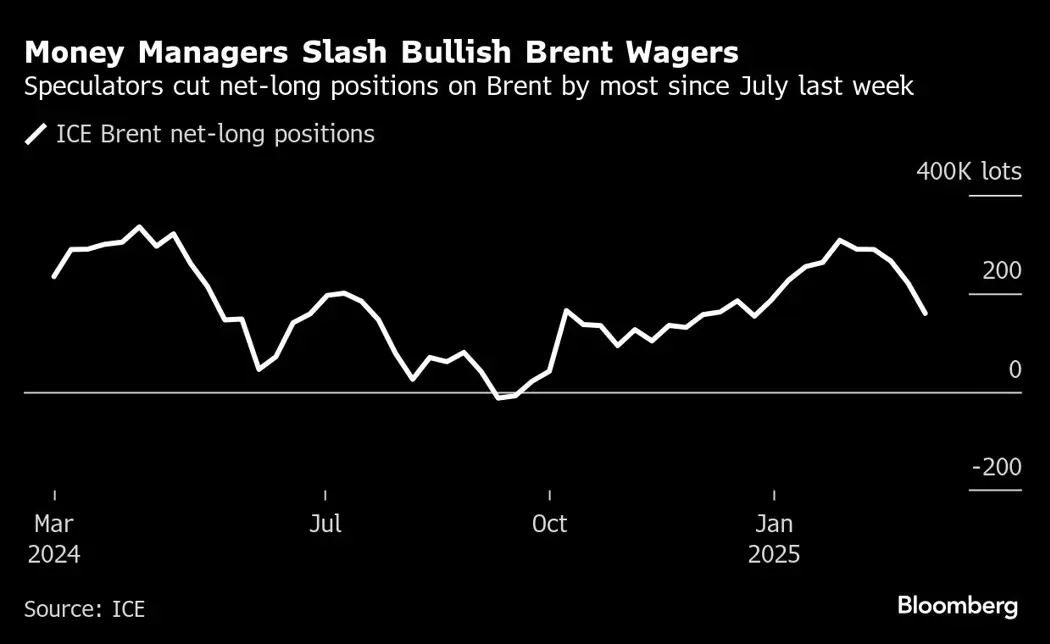 Crude has been hit by a confluence of bearish factors, including the escalating global trade war, plans by OPEC and allies to increase production, and talks to end the three-year war in Ukraine. That’s spurred speculators to cut net-bullish bets on global benchmark Brent by the most since July.