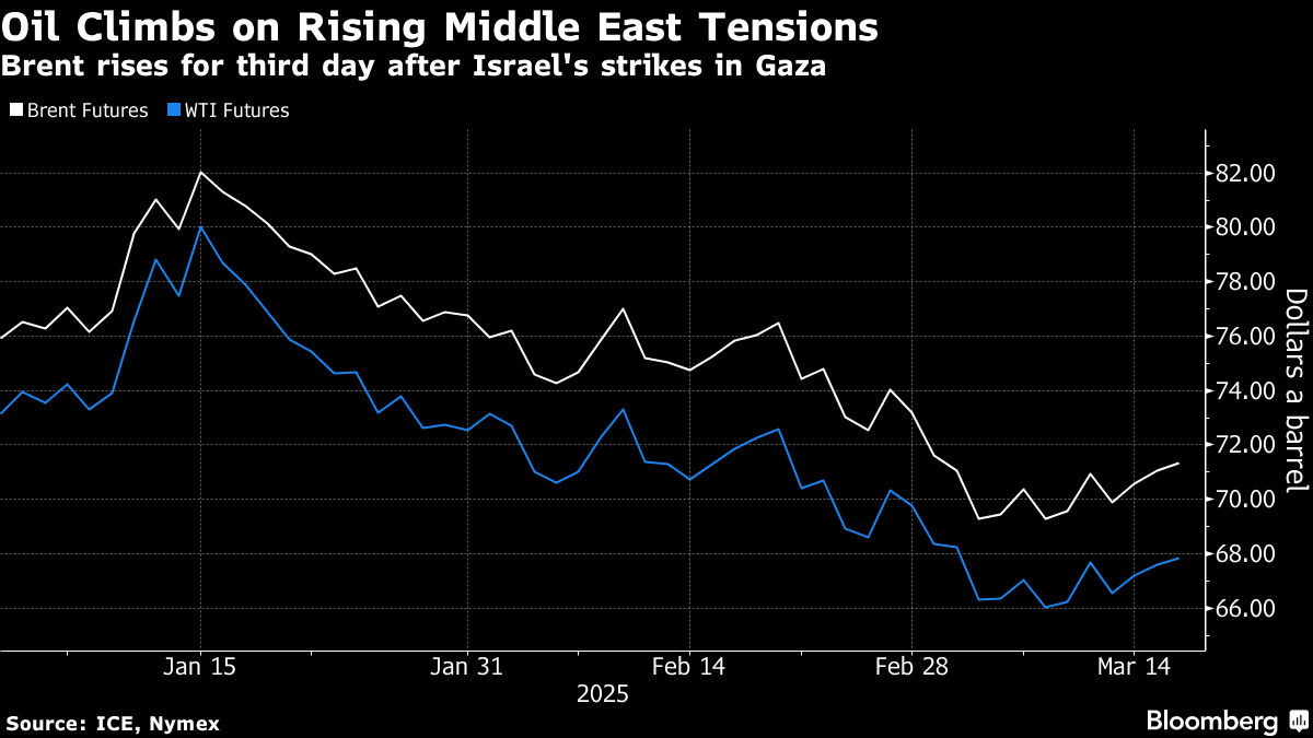 Global crude benchmark Brent traded above $71 a barrel, after rising by 1.7% over the past two sessions, while West Texas Intermediate neared $68. Israel launched a series of military strikes across Gaza, with the nearly two-month-old ceasefire with Hamas appearing to be quickly falling apart.