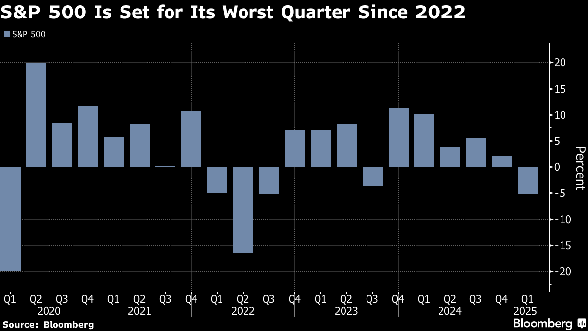 With just one more session left before the end of a quarter that’s set to be the S&P 500’s worst since 2022, the gauge fell 2%. Data showed a plunge in US consumer sentiment and a surge in long-term inflation expectations. That was after another report underscored tepid spending and a pick-up in prices ahead of next week’s big US tariff rollout. A gauge of tech megacaps slumped 3.5%. The yield on 10-year Treasuries sank 10 basis points to 4.26%.