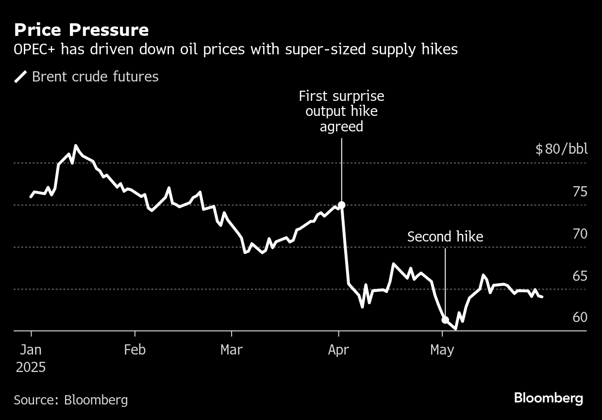 Oil briefly crashed to a four-year low under $60 a barrel in April after the Organization of the Petroleum Exporting Countries and its allies first announced that they would bolster output by triple the scheduled amount. The move came even as faltering demand and Trump’s trade war were already crushing the market.