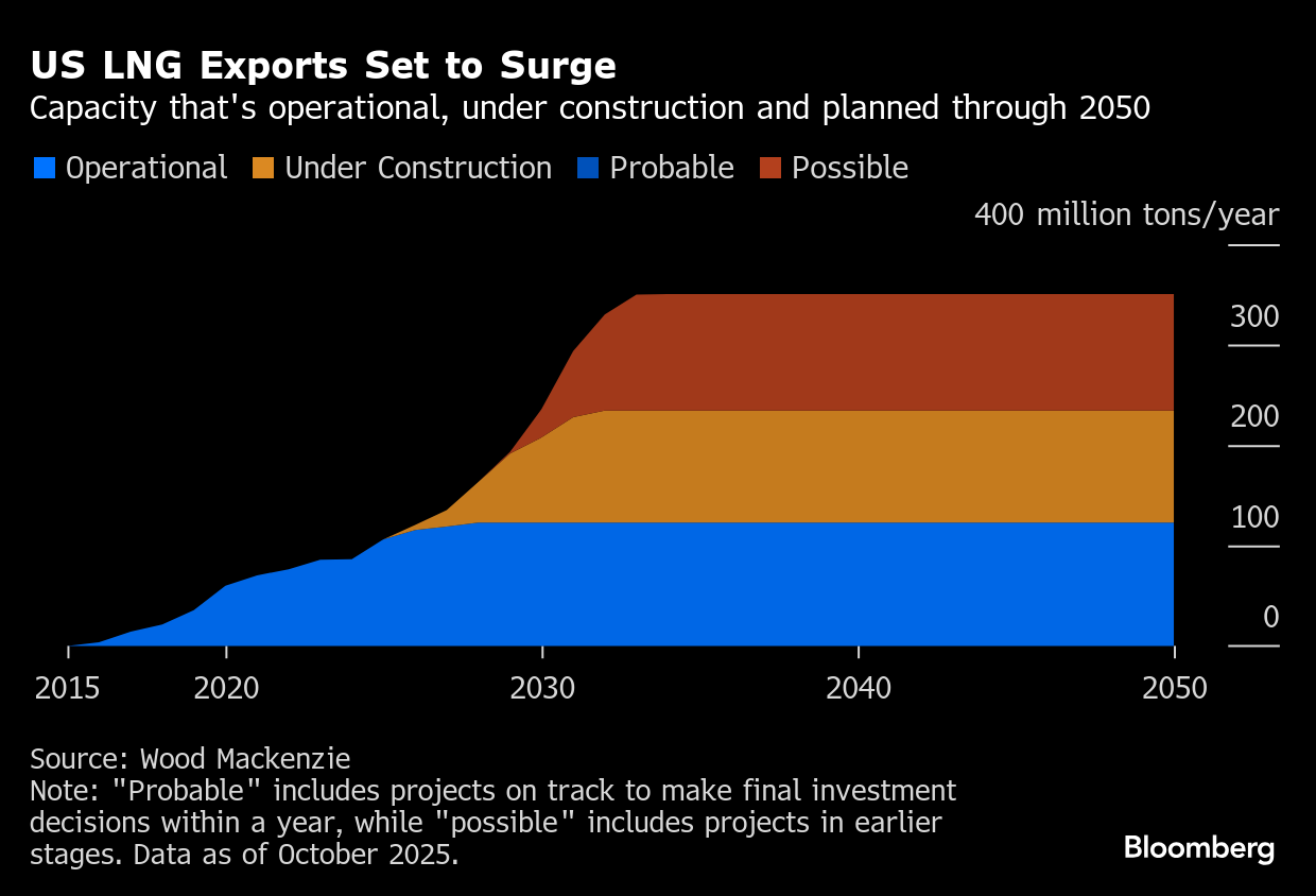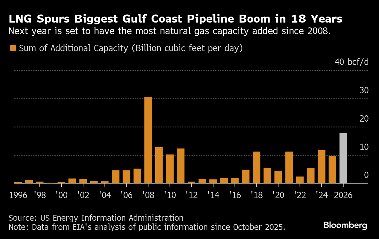 The surge of projects expected to come online in 2026 won’t be a single-year blip. A similar amount of pipeline capacity is on pace to be added to the Gulf Coast in 2027, according to a Bloomberg analysis of US Energy Information Administration estimates.